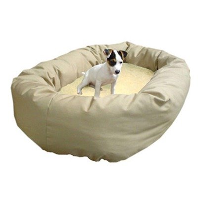 40-inch Khaki and Sherpa Bagel Pet Dog Bed by Majestic Pet Products. Outside Dimensions-40-inch by 31-inch ,Inside Dimensions-30-inch by 21-inch ,Bolster 12-inch high,Cushion 9-inch high. Base made of waterproof 300/600 Denier, the bolster and cushion made of a 7-ounce. Poly/Cotton Twill, stuffed with a Premium High Loft Polyester Fiber Fil. Machine washable; wash warm, tumble dry low. (Large recommended for dogs 45 to 70-pound).